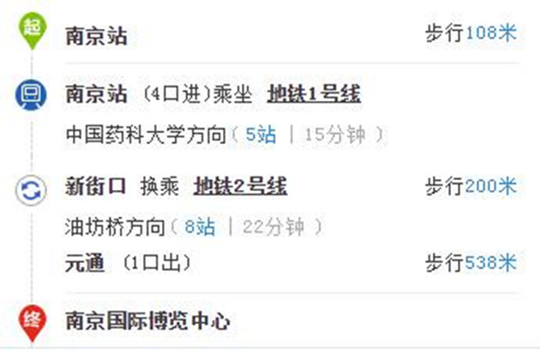 南京站(4口进)乘坐地铁1号线,往中国药科大学方向(5站,15分钟),到新街口换乘地铁2号线,往油坊桥方向(8站,22分钟),到元通站(1口出),步行538米到南京国际博览中心。