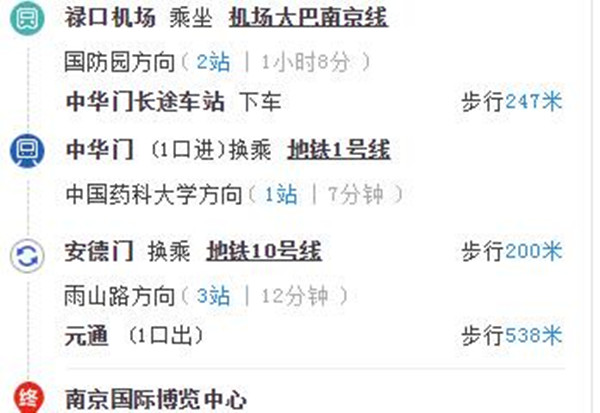 禄口机场乘坐机场大巴南京线,国防园方向(2站,1小时8分),中华门长途车站下车,步行247米至中华门(1口进),换乘地铁1号线,往中国药科大学方向(1站,7分钟),在安德门换乘地铁10号线,往雨山路方向(3站,12分钟),到元通站(1口出),步行538米到达南京国际博览中心。