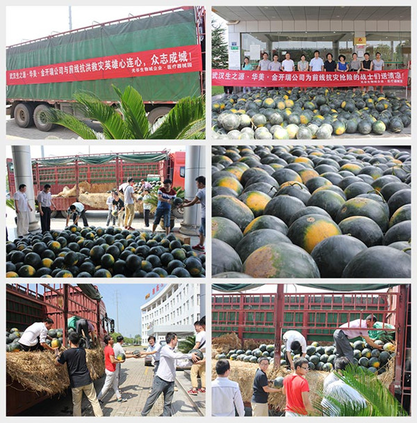 7月8日,公司行政部、人资部、采购部迅速开始组织行动。一方面,联系员工家属采购西瓜。员工家属组织现场采摘最新鲜的西瓜,并于当天将10吨西瓜装车完毕,连夜从湖北松滋出发。另一方面,与佛祖岭街道办事处秦主任联系接洽,沟通、确定慰问的相关事宜。7月9日凌晨,10吨西瓜运至武汉。上午9点半,公司慰问团载满心意,前往佛祖岭向抗洪英雄表达敬意和感谢。