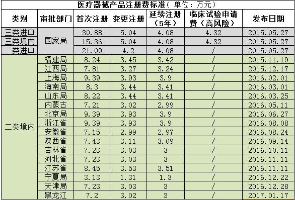 境内第二类医疗器械产品的首次注册收取72000元费用,变更注册收费30200元,延续注册收费30000元。