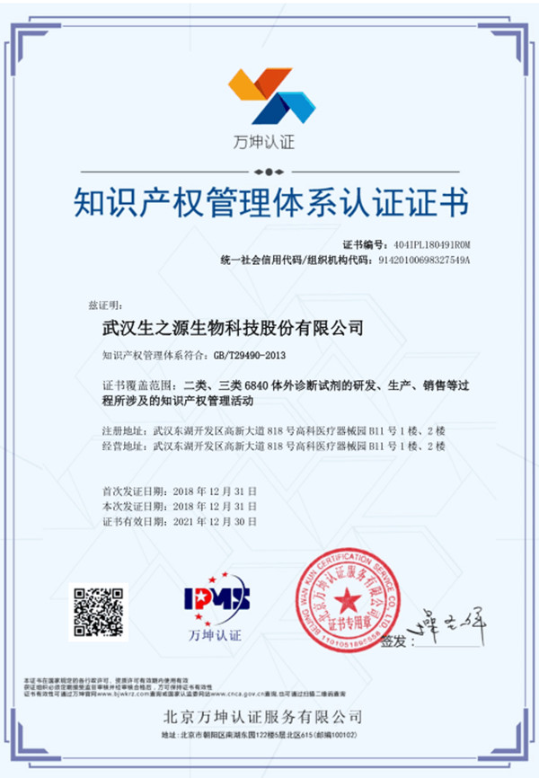 武汉生之源荣获“知识产权管理体系认证”证书