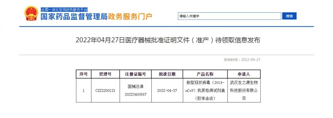 4月27日,武汉生之源生物科技股份有限公司研制的新型冠状病毒(2019-nCoV)抗原检测试剂盒(胶体金法)产品获国家药监局批准上市,是国内第30家新冠抗原试剂获批的企业。