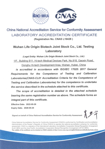 实验室认可证书(注册号:CNAS L16428),这标志着CNAS肯定我司检测实验室的管理水平以及开展体外